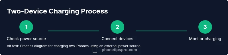 To set up a practical two device charging station, first ensure your power source is charged and supports USB-C PD. Next place both iPhones on a single charging hub or near a power bank with two cables. Use appropriate cables for each device: USB-C to USB-C for newer iPhones, or Lightning to USB-C for older models with USB-C adapters. Keep cables neatly connected and avoid tension that could unplug connectors. If possible, keep the charging area cool to prevent overheating and preserve battery health over time. By arranging a dedicated station, you avoid the temptation to improvise with untested adapters.