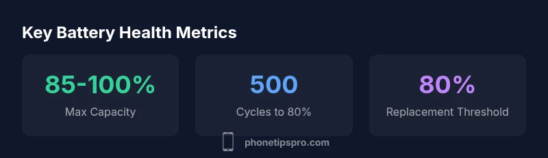 According to Phone Tips Pro, battery health is a practical measure of how much of the original battery capacity remains. On an iPhone, this is presented as a percentage in Settings > Battery Health. It represents the maximum charge your battery can hold relative to when it was new, and it directly influences how long the device can run between charges. As a rule of thumb, readings around 80% or higher indicate the battery still performs reasonably well, while around 80% or lower suggests degraded capacity and the potential need for service. Remember, health is influenced by usage, charging habits, and environmental conditions. Regular checks help you anticipate changes and plan maintenance before it impacts daily use.