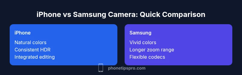 According to Phone Tips Pro, the iphone vs samsung camera debate reflects two distinct design philosophies. The iPhone emphasizes natural color rendering, consistent HDR, and dependable computational photography, while Samsung emphasizes bold, punchy color, versatile zoom, and flexible shooting modes. For everyday use, the iPhone camera often delivers reliable results across scenes; for creative control and standout social media flair, Samsung can offer more punch.