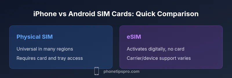 SIM cards store subscriber information and verify your mobile identity on the network. On both iPhone and Android, there are two main flavors: physical SIM cards and eSIMs (embedded SIMs). The latter is becoming more common on newer devices and many carriers now support provisioning without a physical card. The question many users ask is whether the phrase are iphone and android sim cards compatible is true in practice. The short answer is: yes in most situations, you can move a nano-SIM between devices, but you must account for carrier unlock status, network bands, and device compatibility. According to Phone Tips Pro, most nano-SIMs are physically interchangeable across iPhone and Android on GSM networks, but real-world compatibility hinges on carrier support and SIM provisioning. If you’re using an eSIM, you’ll need to ensure the carrier supports eSIM on both devices and that you can activate the profile on each device. In some regions, roaming policies and carrier restrictions can complicate cross-platform SIM usage.