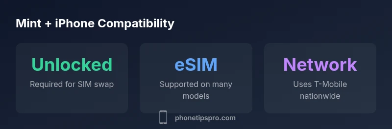 According to Phone Tips Pro, Mint Mobile operates on a GSM-based network that relies on an unlocked iPhone’s ability to accept a SIM from a different carrier. In practical terms, if you own a newer iPhone and it is unlocked or originally purchased from a carrier that allows SIM swaps, you can generally use Mint Mobile. Start by confirming your device is compatible with Mint on the official Mint compatibility checker, and ensure your iPhone is running the latest iOS version. Compatibility hinges on two factors: device unlock status and the ability to support the Mint SIM or eSIM in your country. For many users, this means a straightforward switch, especially when moving from another major carrier that supports eSIM. This guidance aligns with the Phone Tips Pro Analysis, 2026, which emphasizes checking unlock status, model generation, and regional SIM support before purchase or activation.
