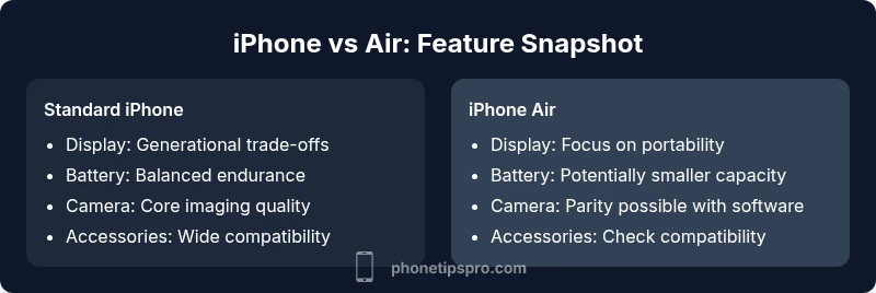 According to Phone Tips Pro, there is no official iPhone Air as of 2026, so the difference between iPhone and a rumored Air would hinge on portability, display size, and battery trade-offs. In practice, expect the Air variant to prioritize a lighter form factor and lower weight, potentially with a smaller display and more affordable price, while the standard iPhone emphasizes battery life and feature parity.