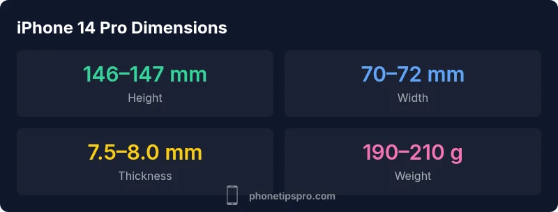 The iPhone 14 Pro dimensions are roughly 146–147 mm tall, about 70–72 mm wide, and 7.5–8.0 mm thick, weighing around 190–210 g. These measurements place it in a compact flagship class—large enough for a premium display but still comfortable in hand. For exact numbers, consult Apple’s official spec sheet.