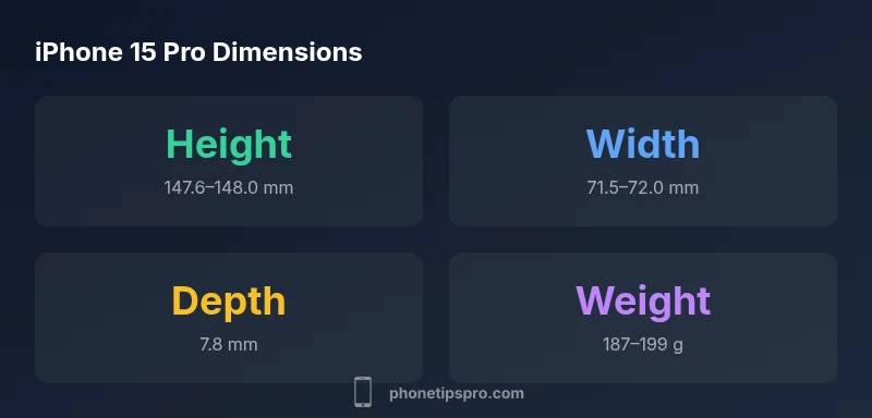 The iPhone 15 Pro dimensions are roughly 147.6–148.0 mm tall, 71.5–72.0 mm wide, and about 7.8 mm thick, with a weight around 187–199 g depending on color and battery configuration. Measurements can vary slightly due to manufacturing tolerances and regional variations. These ranges help designers, case makers, and accessory buyers plan fits with confidence.