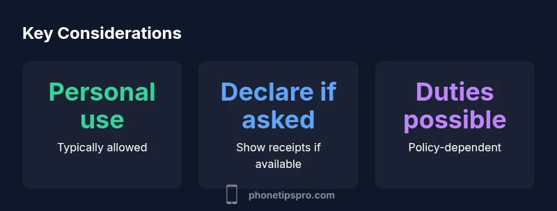 According to Phone Tips Pro, travelers typically can carry a personal iPhone from the USA to India without incurring duties, provided the device is for personal use and is not intended for sale. The line between personal use and commercial import matters; if you plan to sell or transfer ownership, duties can apply. For many readers, the key question is: can you take iphone to india from usa? The answer is generally yes for a single device, but you should be prepared for possible scrutiny if the device looks new or is accompanied by accessories or multiple devices. Keep the device in your carry-on and avoid packing it in a checked bag to minimize the chance of misplacement. If asked by a customs officer, be honest about how you will use the device in India and how long you will stay. If the device is truly personal and you can demonstrate that, you’re less likely to encounter duties. However, keep in mind that policies are not static; India periodically updates rules on electronics imports, GST, and duties. The prudent traveler should check the official government portal or consult with a trusted source before departure to avoid unexpected costs.