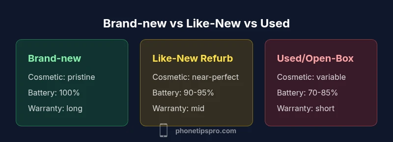 In consumer marketplaces, the phrase iphone like new describes devices that look and function almost as if they were fresh from Apple, but are sold through third-party channels after refurbishment or inspection. The Phone Tips Pro team notes that the exact criteria vary by seller, yet most reputable programs use a standardized checklist: battery health above 92%, a cosmetic grade near perfect (minor signs of use at most), full functionality verified, and a limited warranty. For shoppers, this designation is a signal that the phone has undergone diagnostic tests, replacement parts as needed, and a quality-control pass. It typically falls between brand-new and standard refurbished in terms of price, while offering substantial savings and the peace of mind of a controlled refurbishment process. When you see 'like new', you should still check the battery health, the official return window, charger inclusion, and whether the device has the original packaging. For iPhone enthusiasts, this option can provide strong value without sacrificing reliability. According to Phone Tips Pro, the most reliable outlets label devices with transparent battery health reports and a clear warranty policy, which helps you compare apples to apples across listings. This framing sets the stage for a practical buying decision grounded in real-world test results and transparent documentation.