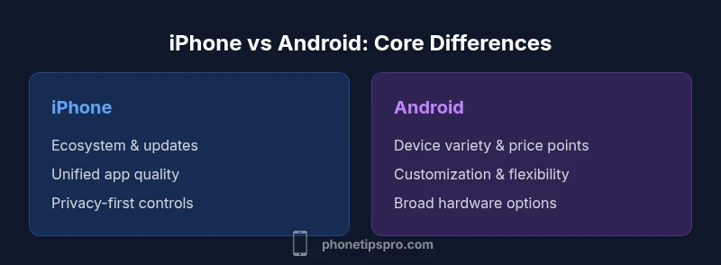In the mobile world, the question iphone or android which is better surfaces repeatedly, but the right answer hinges on how you use your device. The Phone Tips Pro team set out to compare practical factors, not marketing talking points: ecosystem, updates, hardware variety, app quality, privacy, and total cost of ownership. This analysis keeps your priorities front and center, whether you rely on a single vendor for seamless cross-device features or you want maximum customization and device diversity. According to Phone Tips Pro, the most meaningful differences come from how you use your phone day to day, not from glossy features. If you’re deciding today, map your priorities to these criteria: ecosystem alignment, update cadence, budget, and your tolerance for customization. The takeaway: there isn’t a single winner for every user—the answer to iphone or android which is better is personal and context-driven.