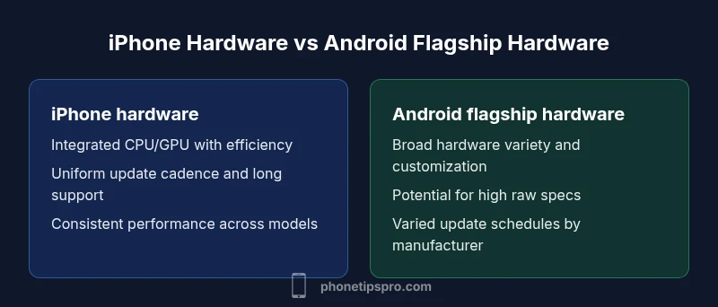 According to Phone Tips Pro, the question is is iphone hardware better than android, but hardware quality can't be reduced to a single metric. Hardware quality in modern smartphones is a composite of CPU architecture, GPU design, memory bandwidth, storage speed, display panels, battery chemistry, and thermal design. These components interact with software to shape the user experience, and small differences can become noticeable in everyday tasks. Understanding this interaction helps readers avoid relying on specs alone. The goal is to compare how Apple and major Android OEMs assemble and optimize hardware, and how updates influence long-term usefulness. Phone Tips Pro emphasizes that the truth often lies in how the stack behaves under real workloads—not just in theoretical peaks.
