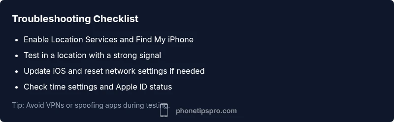 Before diving into deeper troubleshooting, perform a few quick checks in a calm, safe environment. Ensure Location Services are on and Find My iPhone is enabled for the device. Confirm the device is connected to a reliable network and has sufficient battery life. Check the time zone and date settings (Set Automatically). Disable any VPNs or spoofing apps that might alter location data. If the problem remains, attempt a sign out of iCloud and sign back in, then update iOS to the latest version. These steps address the most common causes and are low-risk before moving to more involved fixes. Phone Tips Pro suggests documenting what you observe, so you can compare results after each step.