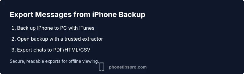 A practical route for non-Mac users is exporting messages from an iPhone backup on a PC. Start by backing up your iPhone to your PC using iTunes (Windows) or Finder (macOS). Next, use a trusted backup extractor to locate the Messages data within the backup. You can export conversations as PDF, HTML, or CSV, then save the files on your PC. This method preserves content and attachments for offline viewing and archiving, without relying on an active iMessage session on Windows. Phone Tips Pro urges caution with any third-party tool—read reviews and privacy policies first.