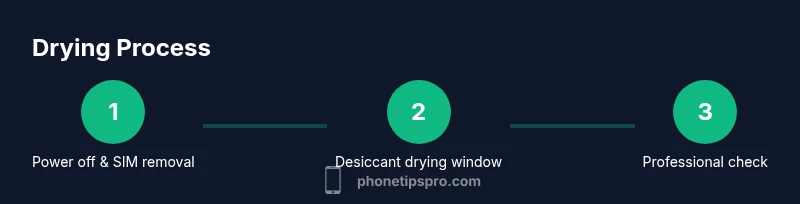 The most reliable approach is to minimize moisture quickly and dry the device using proven methods. Desiccants like silica gel packets, when used correctly, can draw moisture from surfaces and ports more effectively than rice. Keep the phone away from heat sources and humidity while you prepare a safe drying setup. Phone Tips Pro Analysis, 2026 emphasizes that containment and gradual desiccation are key. A protective case should be removed to expose ports for airflow, and you should avoid attempting to power on the device during the drying window. If a desiccant kit is not available, a well-ventilated room with low humidity can help, but it should not be relied upon for rapid drying.