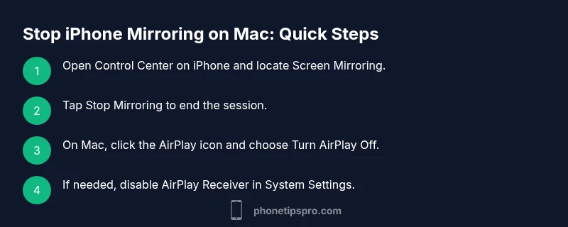 Stop iPhone mirroring on Mac by disabling AirPlay mirroring on iPhone via Control Center and turning off AirPlay Receiver on Mac. Start from iPhone: open Control Center > Screen Mirroring > Stop Mirroring. Then on Mac: click the AirPlay/Screen Mirroring menu in the menu bar and choose Off. Ensure AirPlay Receiver is disabled if you want to prevent future mirroring.