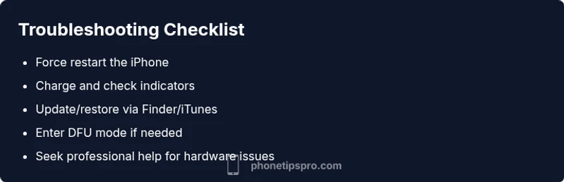 If force restart doesn’t fix the issue, check for hardware signs like a loose display cable or water exposure. Proceed with software recovery (Update/Restore) via Finder/iTunes, and consider DFU mode if needed. If nothing resolves it, seek professional service.