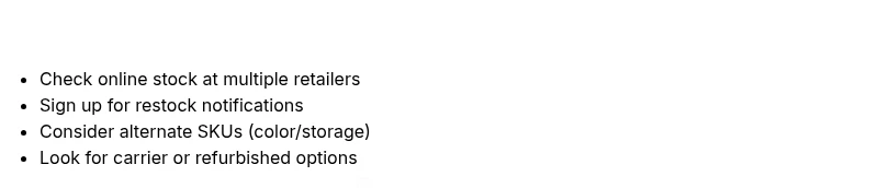 - Consider alternative SKUs (different color or storage size) that may be stocked sooner.