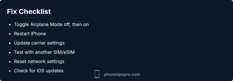 - Toggle Airplane Mode on, wait 5–10 seconds, then off to refresh radio connection.
