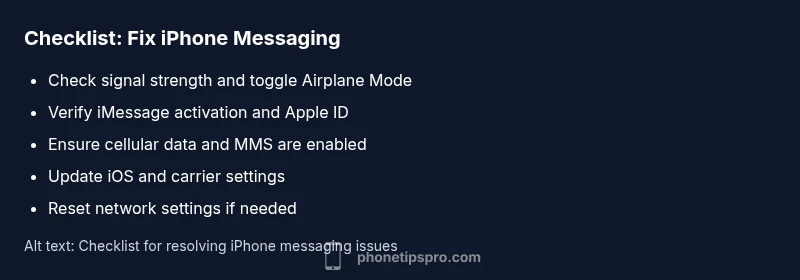 According to Phone Tips Pro, the most likely reason why iphone can't send message is a misconfigured messaging setting or a network issue. Start with quick fixes: toggle iMessage off and on, verify cellular data is active, and ensure your SIM is functioning. If the problem persists, follow the diagnostic flow below and apply the step-by-step fixes.