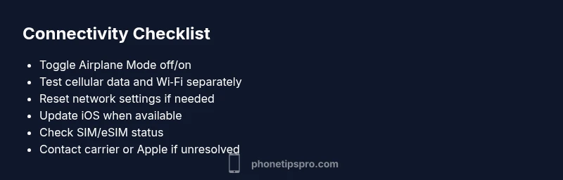 If you're wondering why iphone has no internet connection, you're not alone. Connectivity problems on iPhone stem from a mix of software glitches and network settings. In many cases a quick reset fixes things, but understanding the underlying causes helps prevent repeats. According to Phone Tips Pro, most no-internet incidents start with a simple misconfiguration or a temporary outage and can be resolved without heavy troubleshooting. The term no internet covers both cellular data and Wi‑Fi. If cellular data is off, you won't get online even with full signal. If Wi‑Fi shows a connected status but no pages load, the issue could be DNS, router settings, or an ISP outage. This guide walks you through steps from fastest checks to deeper fixes, with safety reminders and a plan to escalate if needed. First, stay calm and work methodically. Start with the easiest toggles and device restarts, then verify network health across Wi‑Fi and cellular connections. Note any recent changes such as a software update, new VPN, or a different SIM card, as these are common culprits. A structured approach reduces time and frustration. For iPhone users, it's essential to differentiate between a total loss of internet and intermittent drops. If the iPhone can reach some websites but not others, DNS or content filtering might be involved. If pages never load, you may have a broader network or device issue. In any case, the most effective plan combines quick resets with targeted checks to avoid unnecessary steps.
