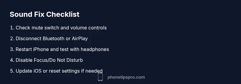Start with the mute switch and volume controls, then verify Bluetooth connections and Focus modes. If the problem remains, move to a restart and software updates. These steps solve most no-sound issues without hardware tests.