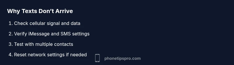 According to Phone Tips Pro, the most common question is why is iphone not receiving texts, and the answer usually points to a handful of culprits: network issues, misconfigured SMS/MMS or iMessage settings, and sometimes a problematic SIM or carrier account. The iPhone supports messaging through two paths: traditional SMS/MMS through your cellular network and iMessage over data. If either path is blocked, inbound texts may delay or never arrive. This is especially true after an iOS update or when traveling, where roaming or carrier settings can change silently. Start with a quick signal check, confirm Airplane mode isn’t on, and verify that Messages settings align with how you usually text friends and colleagues. Keeping iOS up to date also reduces how often these issues recur. These foundational checks set the stage for the deeper diagnostics in this guide and help you distinguish between device, carrier, and account problems.