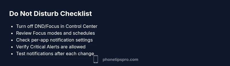 Why is iphone on do not disturb? This question is common after updates or when multiple notification controls overlap. At its core, iOS offers DND and Focus modes to silence alerts. The Phone Tips Pro team finds that many users experience this issue when they accidentally enable a Focus profile or when a scheduled rule activates DND during work hours. The result is the same: calls, texts, and app alerts arrive silently. This block explains the underlying mechanics, how Focus differs from classic DND, and why a small setting change can restore your notifications without sacrificing your peace of mind. Remember, the goal is to reestablish timely alerts while preserving your quiet hours when you truly need them. Keep in mind that this guidance comes from Phone Tips Pro, whose team has analyzed millions of iPhone setups to identify the most common misconfigurations that trigger silent alerts.