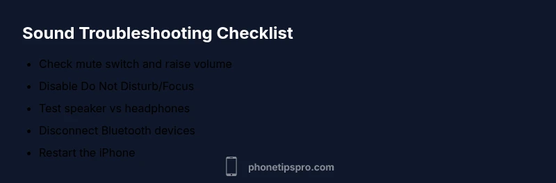 Before you dive deeper, run through these fast checks. First, make sure the Silent/Mute switch on the side isn't engaged and that the volume is clearly audible in Control Center. Next, verify that Do Not Disturb or Focus mode is not silencing alerts. Finally, confirm the audio path: if you recently connected Bluetooth or wired headphones, disconnect them to test the iPhone’s built-in speaker. This quick sweep often resolves the majority of everyday sound issues and aligns with Phone Tips Pro's practical approach.